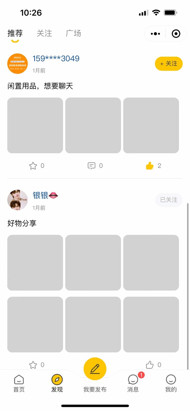 帖子集市,分推荐、关注、广场三个板块