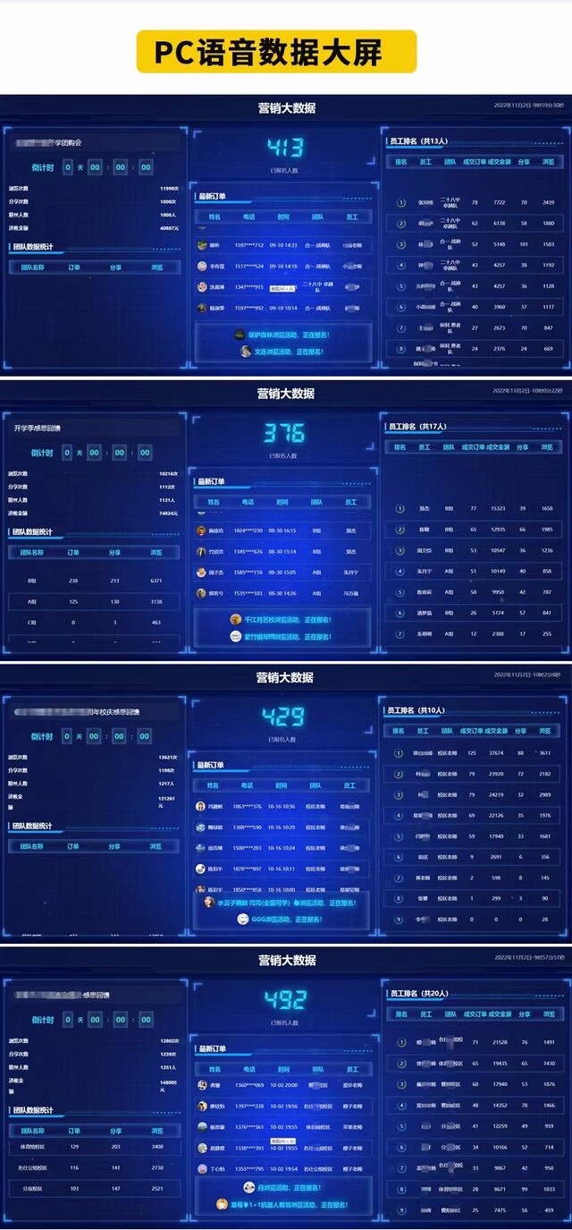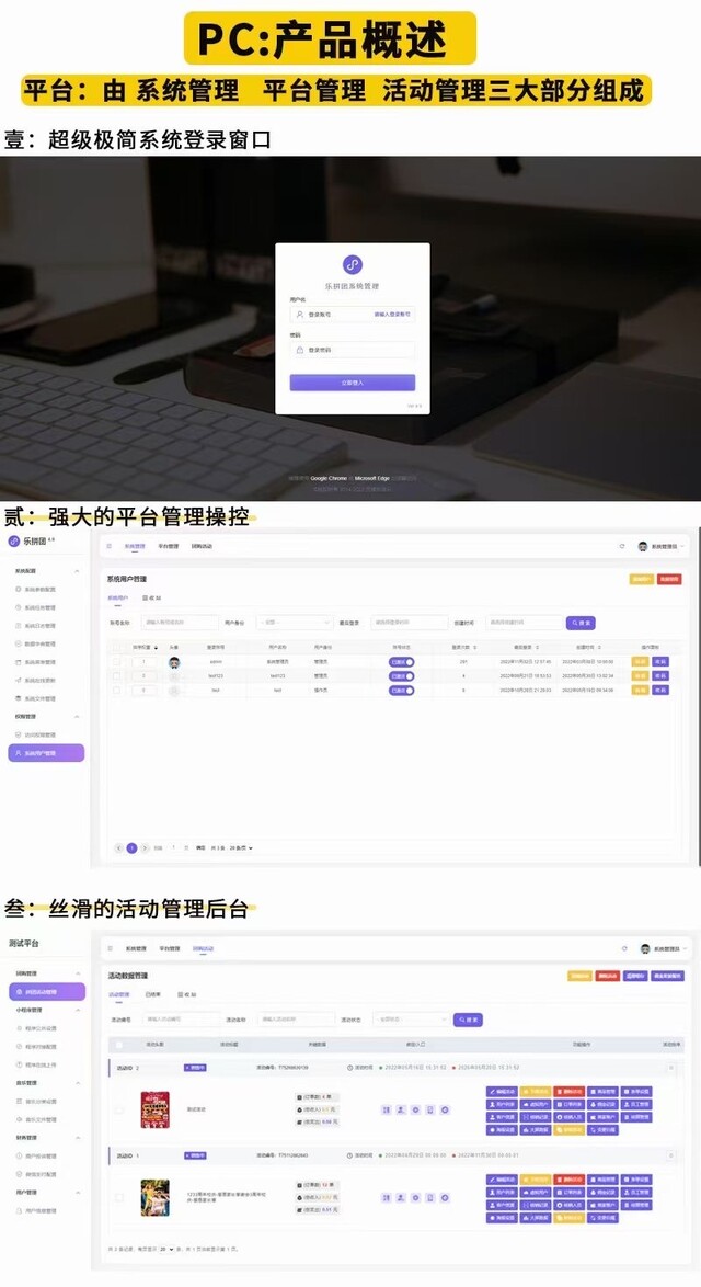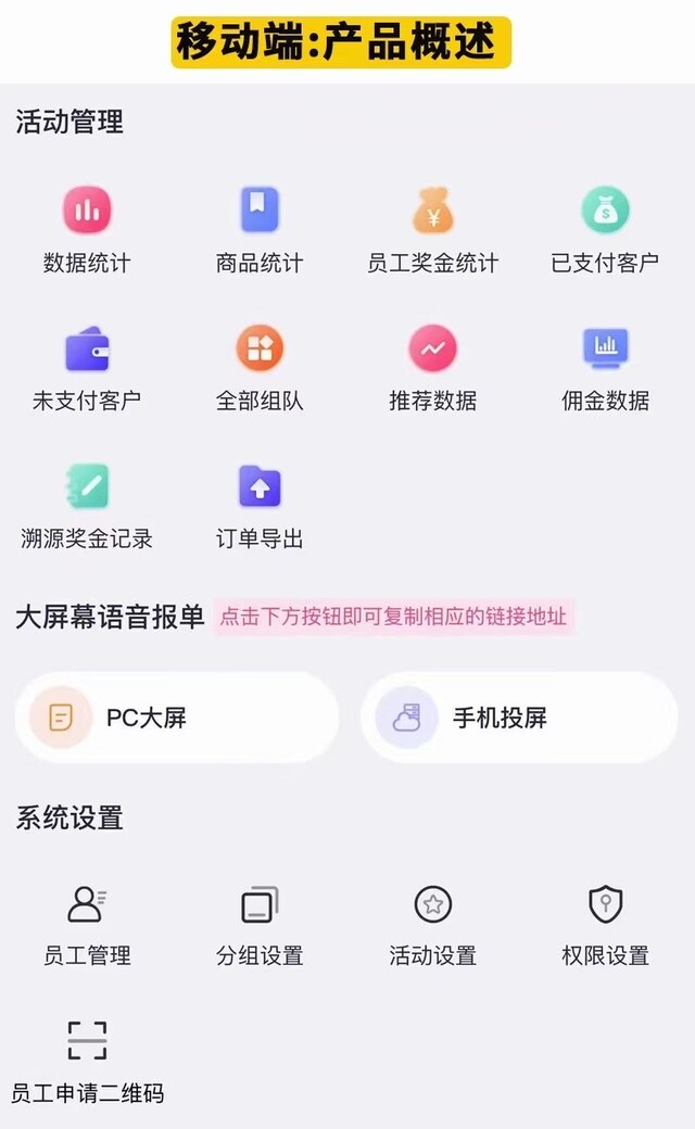 活动管理:数据统计、商品统计、员工奖金统计、全部拼团组队记录、上下级推荐数据、佣金数据、溯源奖金记录、订单一键导出等;