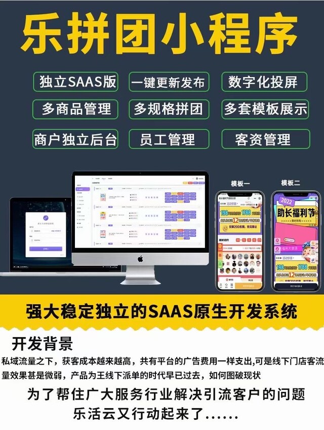 平台特色:一键更新发布前端、数字化投屏、多商品管理、多规格拼团、多套模板展示、商户独立后台、员工管理、客资管理等;