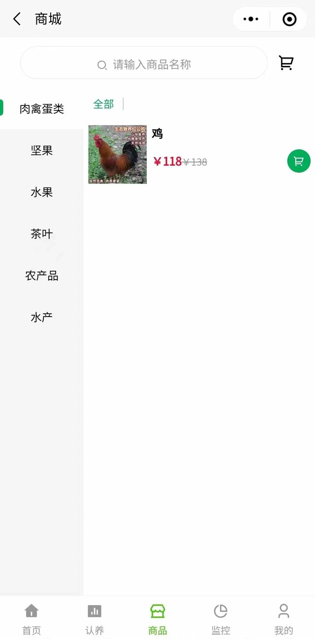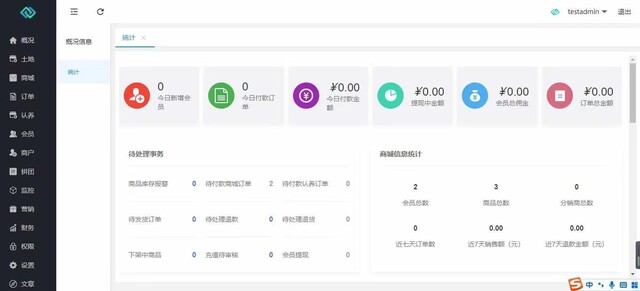 系统概况、土地管理、商品管理、订单管理、财务管玾、认养管理、会员管理、监控管理、商家管理、拼团管理、砍价管理、文章管理、积分管理、活动管理、卡券管理、广告管理、枚限管理。