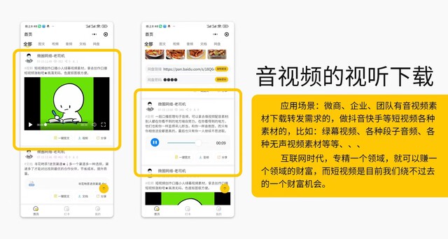 应用领域:微商素材、知识付费、资源共享、抖音素材、考研资料、公文报告、PPT模板、音频素材、视频资源、表情包头像、流量主;