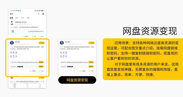 特色功能:一键图文发圈、文档阅读下载、网盘资源变现、音视频下载、订阅消息通知、创作者入驻、创作者主页、会员特权自定义;