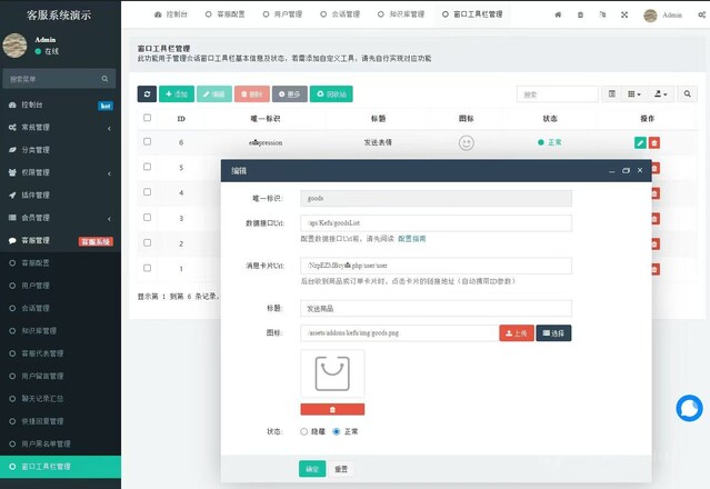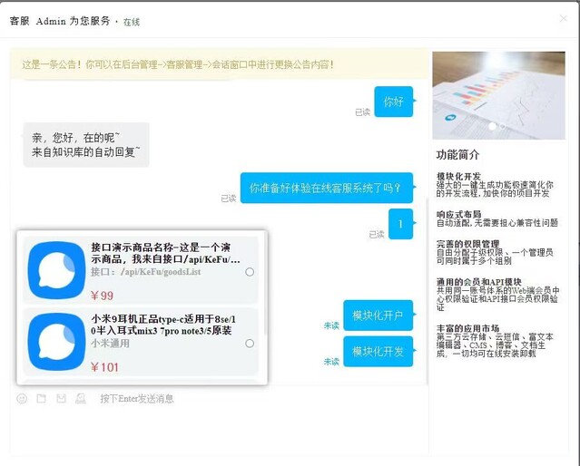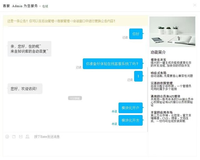 富文本支持:支持文字、表情、图片、附件,发送商品、发送订单,后台支持快捷回复、加入黑名单