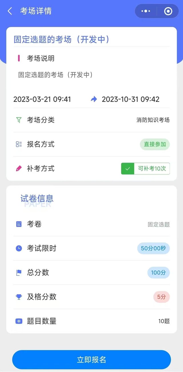 在考场时间范围内,可设置补考模式、补考次数,不及格可参与补考