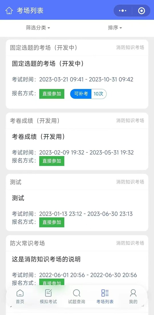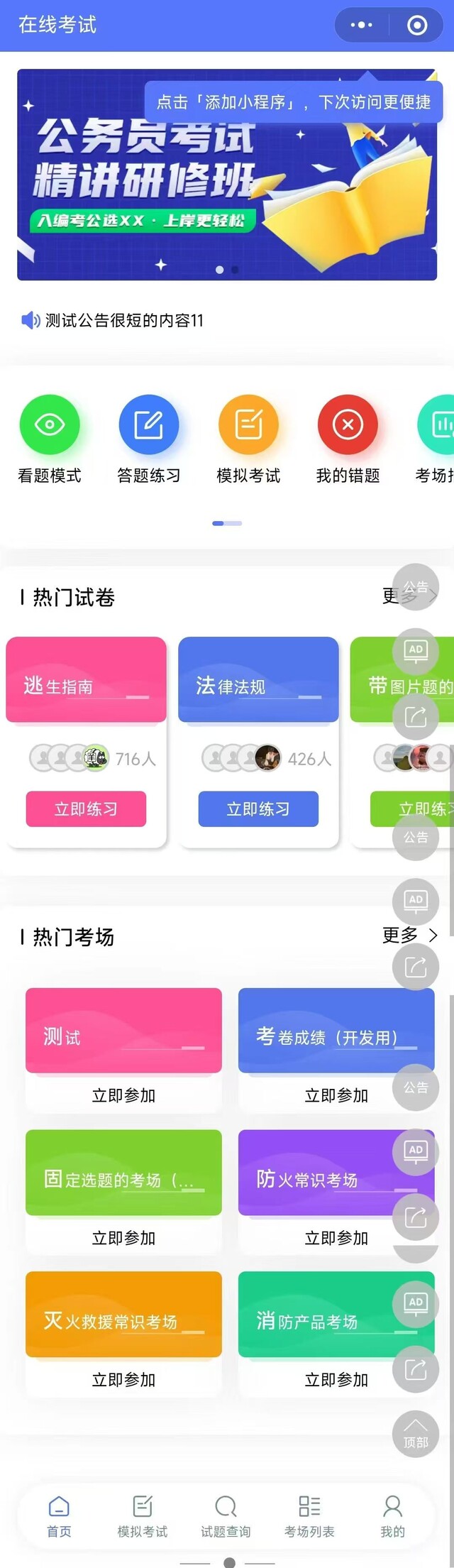 可发布考试、考场相关公告,在首页显示