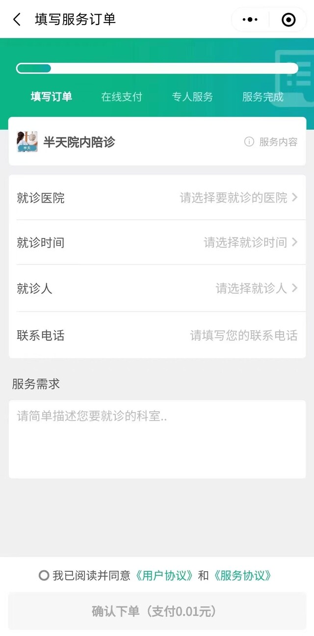 下单流程简单,针对不同类型服务只需填写相应必要的信息即可快速下单,陪护师接单后与客户电话沟通安排服务。