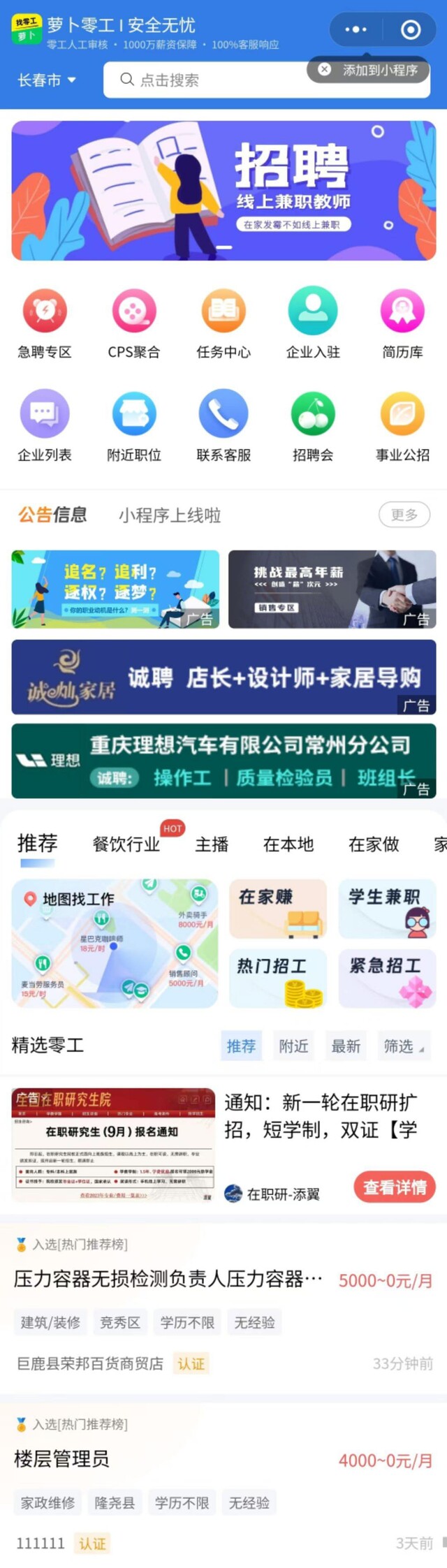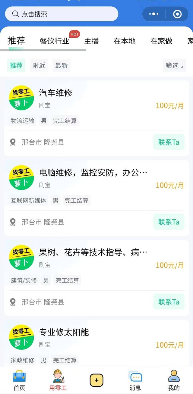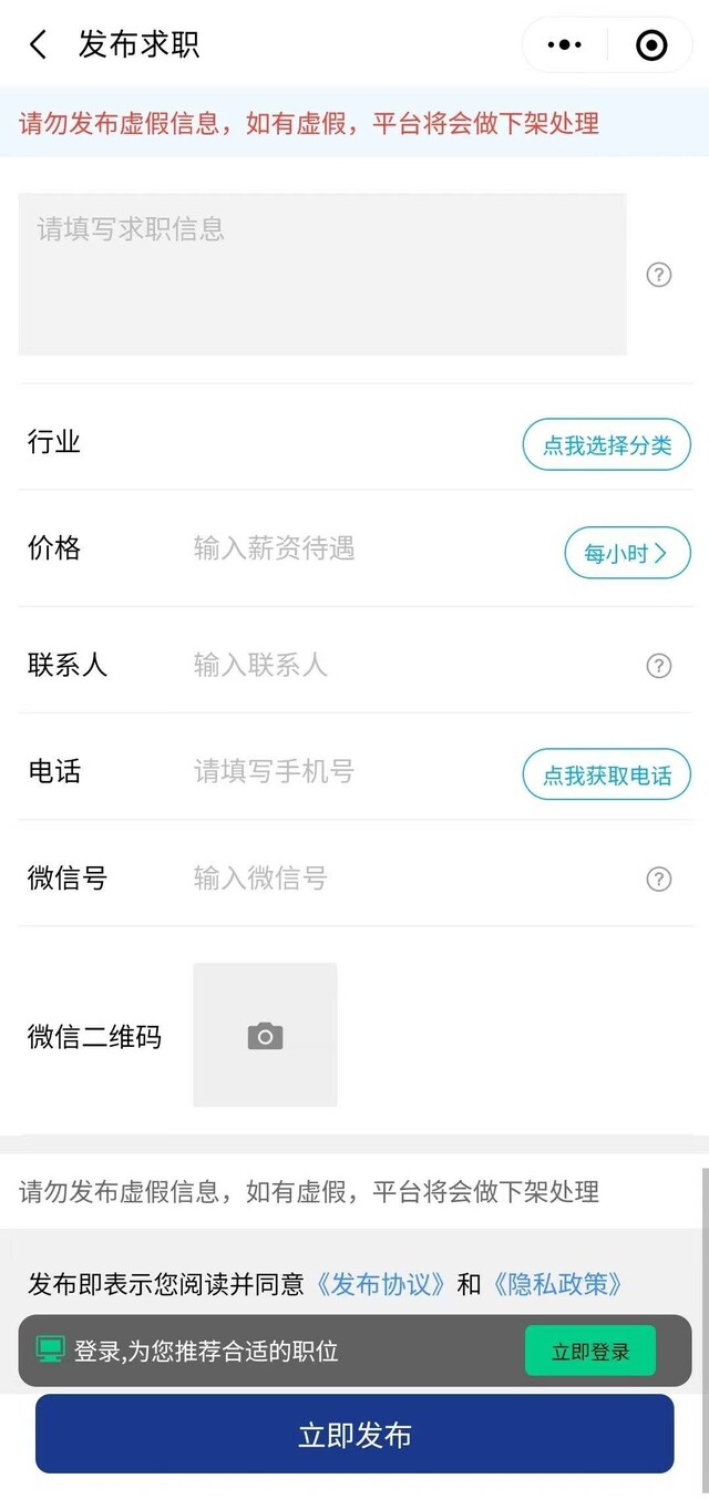 前端开放招聘信息发布入口,支持企业 / 个人认证后发布全职、兼职、灵活用工(找活儿)等多类型岗位;